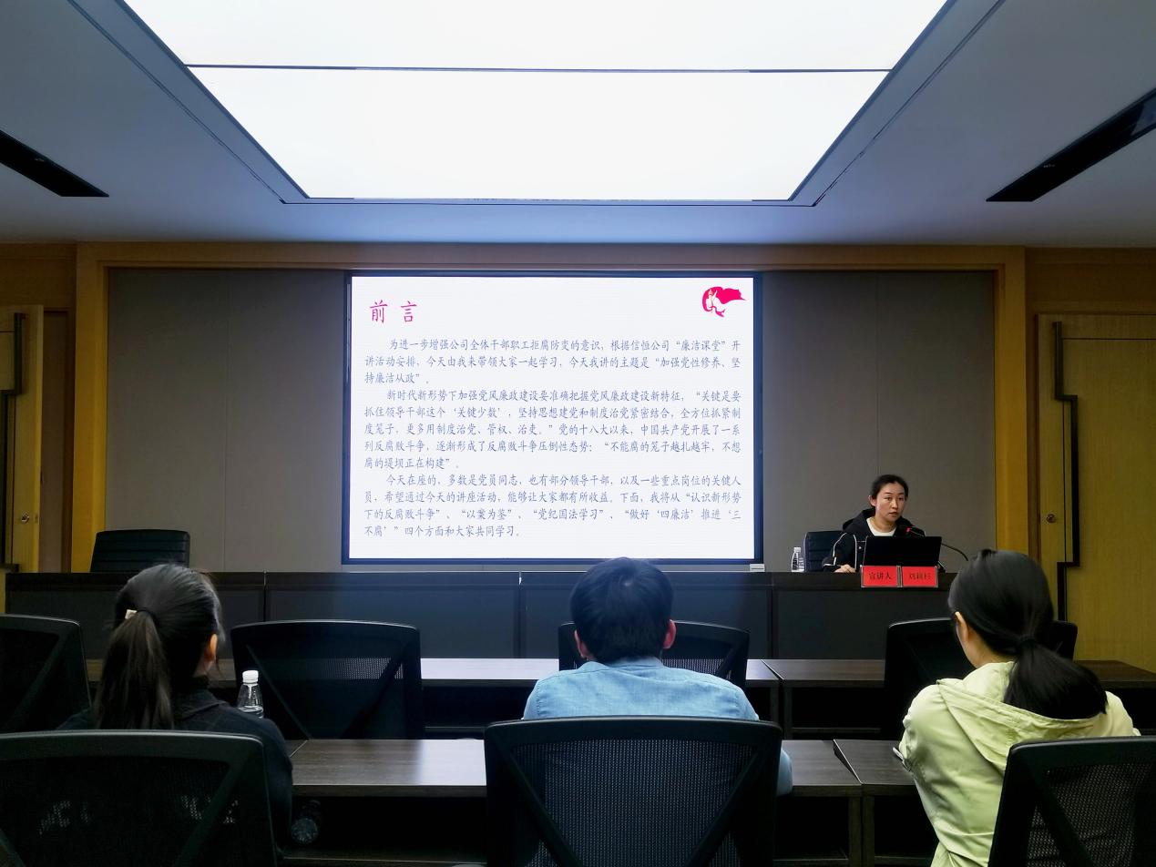 本期廉潔課堂的主題為“加強(qiáng)黨性修養(yǎng),堅(jiān)持廉潔從政”,劉莉杉同志從思想政治、道德修養(yǎng)、業(yè)務(wù)工作三個(gè)方面分析了新形勢下反腐敗斗爭的現(xiàn)狀,闡釋了堅(jiān)持反腐敗斗爭和廉潔從業(yè)的重要性。同時(shí)對國有企業(yè)腐敗案例進(jìn)行了深入剖析,重點(diǎn)對“靠企吃企”現(xiàn)象進(jìn)行了深度解讀。引導(dǎo)全體干部職工要充分汲取違規(guī)違紀(jì)案例教訓(xùn),時(shí)刻保持“如履薄冰、如臨深淵”的警覺,以案為鑒、以案明紀(jì)、以案促改。要認(rèn)真學(xué)習(xí)黨的紀(jì)律,加強(qiáng)自身思想道德建設(shè),堅(jiān)定理想信念,筑牢廉潔防線,時(shí)時(shí)刻刻知敬畏、存戒懼、守底線,進(jìn)一步增強(qiáng)“四個(gè)意識”、堅(jiān)定“四個(gè)自信”、做到“兩個(gè)維護(hù)”。作為國有企業(yè)的員工,面對手中的權(quán)利,不僅要保持思想上的清醒,更要保持政治上的定力,通過“廉潔從政、廉潔用權(quán)、廉潔修身、廉潔齊家”不斷錘煉黨性,增強(qiáng)拒腐防變的能力。