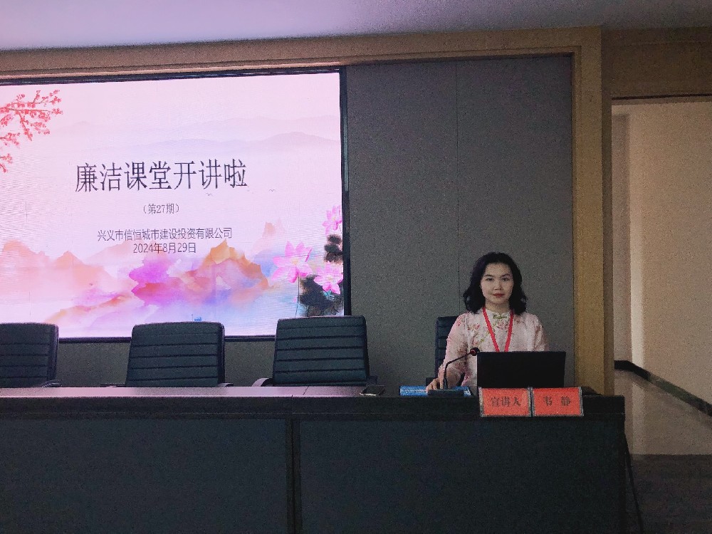 2024年8月29日,興義市信恒城市建設投資有限公司(以下簡稱“市信恒城投公司”)2024年第27期“以學鑄魂強黨性,崇尚崇廉促發(fā)展”廉潔課堂開講啦持續(xù)開講。本期宣講由市信恒城投公司下屬子公司興義市信恒商貿有限公司副經理韋靜同志主講,特邀公司中層以上干部、黨建指導員、紀檢監(jiān)察專員及部分職員參加。