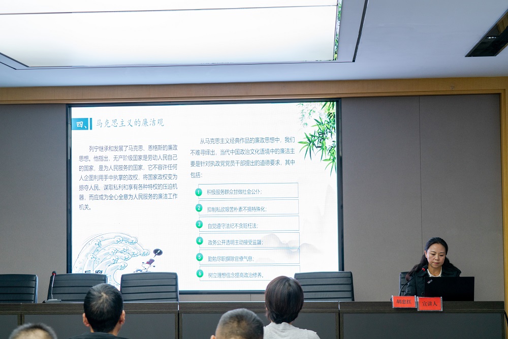 本次宣講的主題為:“興廉潔之風(fēng) 樹浩然正氣”,胡忠紅同志通過五個(gè)方面與大家進(jìn)行分享。